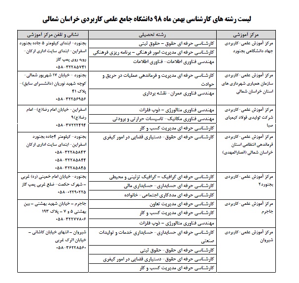 لیست رشته های مهندسی فناوری و کارشناسی حرفهای «ناپیوسته» نظام آموزش مهارتی دانشگاه جامع علمی کاربردی واحد خراسان شمالی - بهمن ماه سال ۱۳۹۸