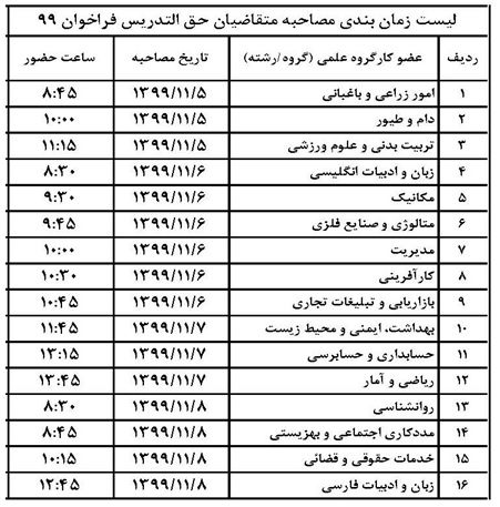 اطلاعیه شماره2- برنامه زمان بندی مصاحبه علمی جذب مدرسان حق التدریس فراخوان شهریور 99