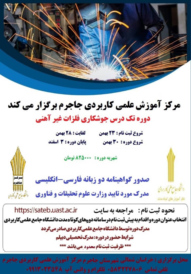 مرکز آموزش علمی کاربردی جاجرم برگزار می کند : دوره تک درس جوشکاری و فلزات غیرآهنی